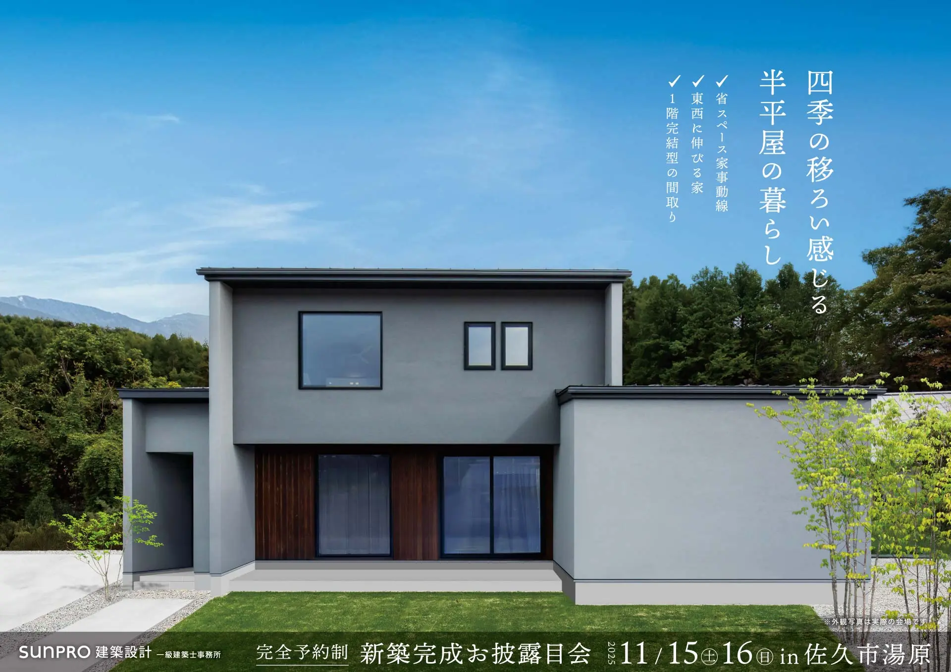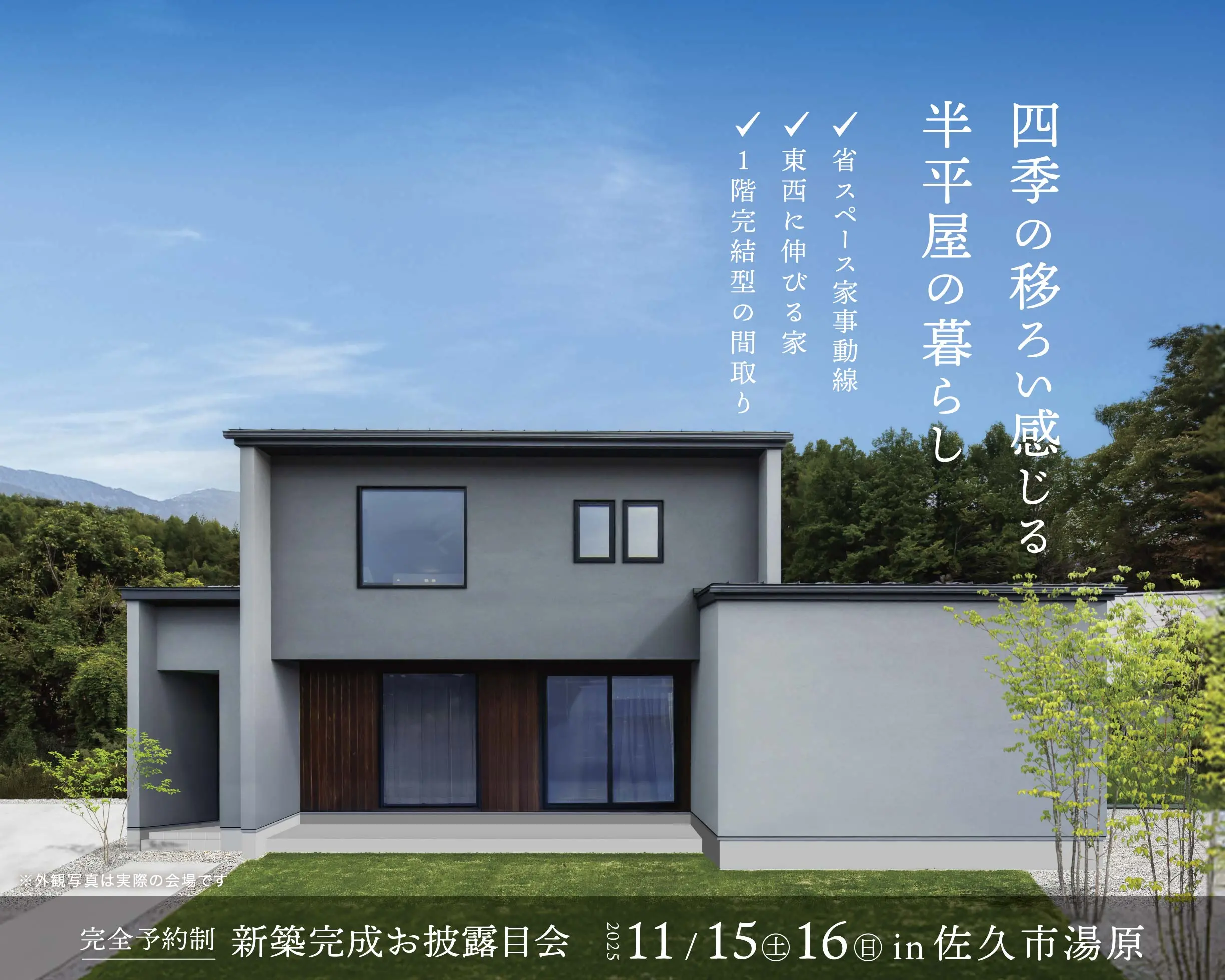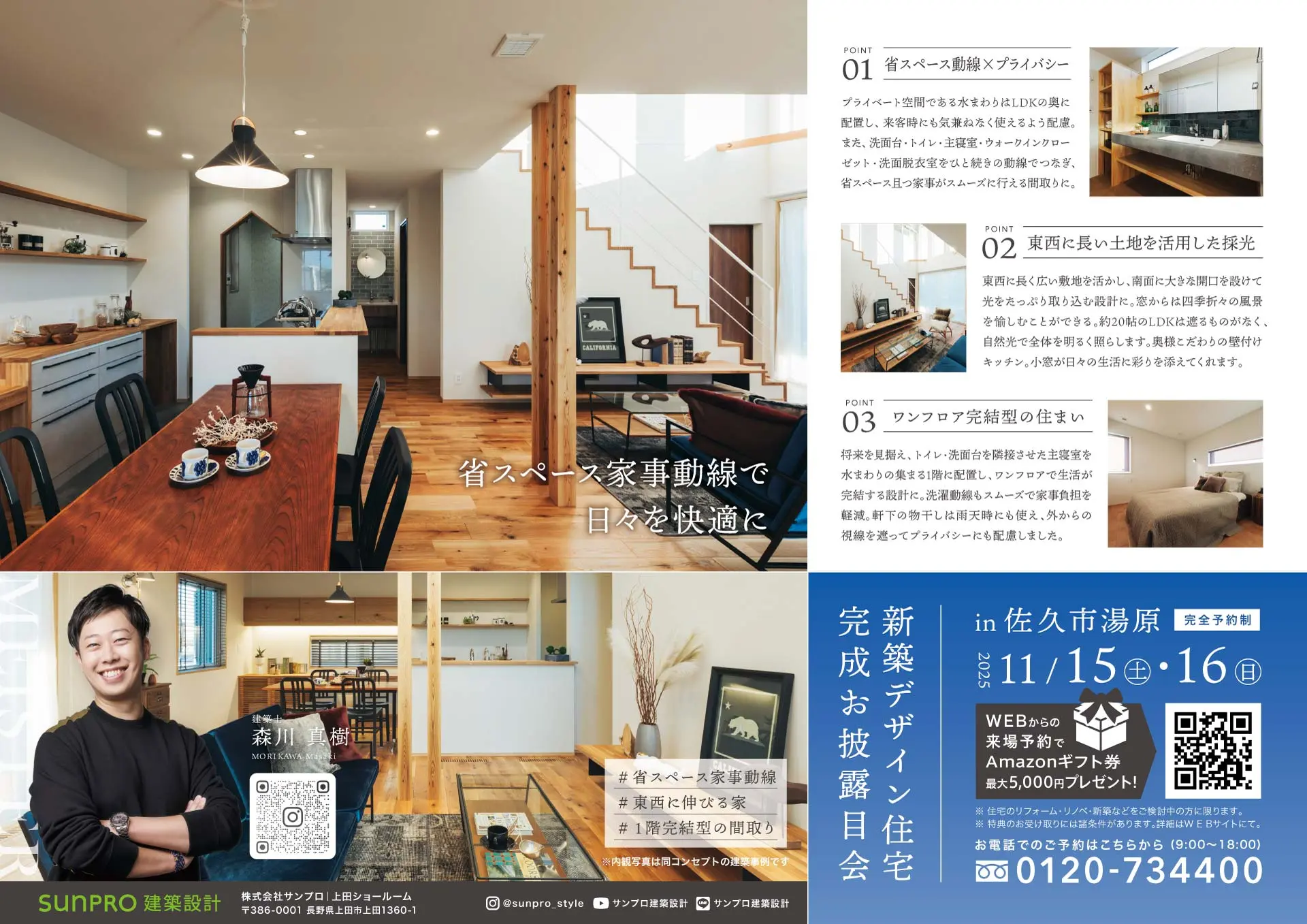 1階で生活のほとんどが完結する設計、さらにコンパクトな生活動線にまとめたことで、今もこれからも暮らしやすいお住まいです。東西に広い敷地のメリットを活かした大開口もポイント。会場にてぜひご覧ください。