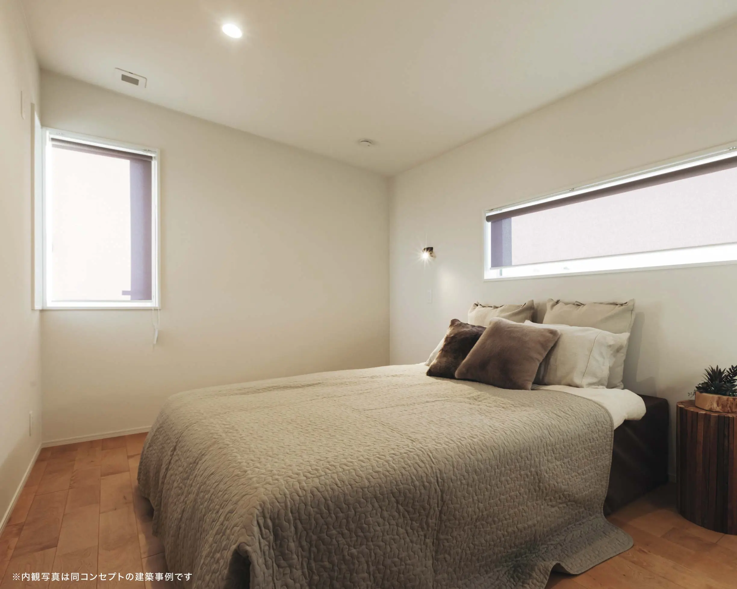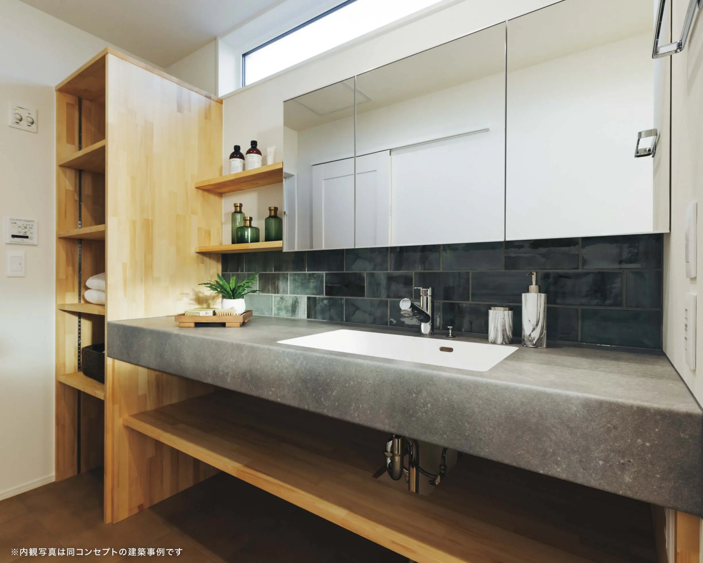 プライベート空間である水まわりはLDKの奥に配置し、来客時にも気兼ねなく使えるよう配慮。また、洗面台・トイレ・主寝室・ウォークインクローゼット・洗面脱衣室をひと続きの動線でつなぎ、省スペース且つ家事がスムーズに行える間取りに。