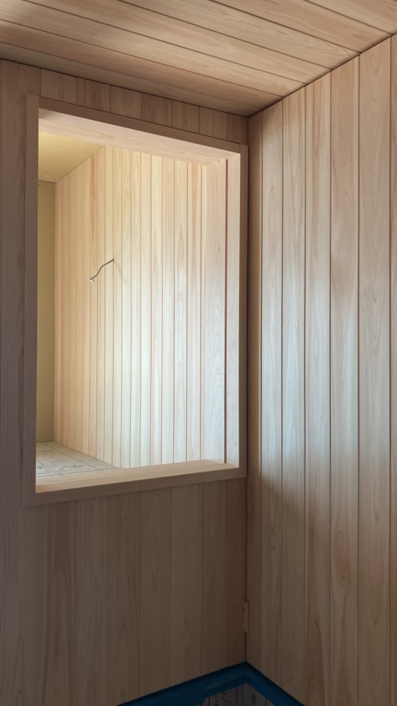 ヒノキを張った浴室から脱衣室。