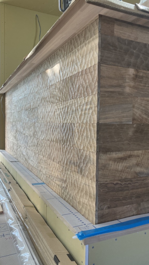 なぐり加工された板を使用したキッチン腰壁。