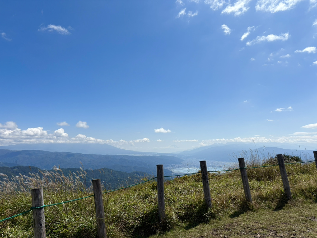 山頂からは諏訪湖を見下ろせて、その向こうにはうっすら富士山まで見えていました。